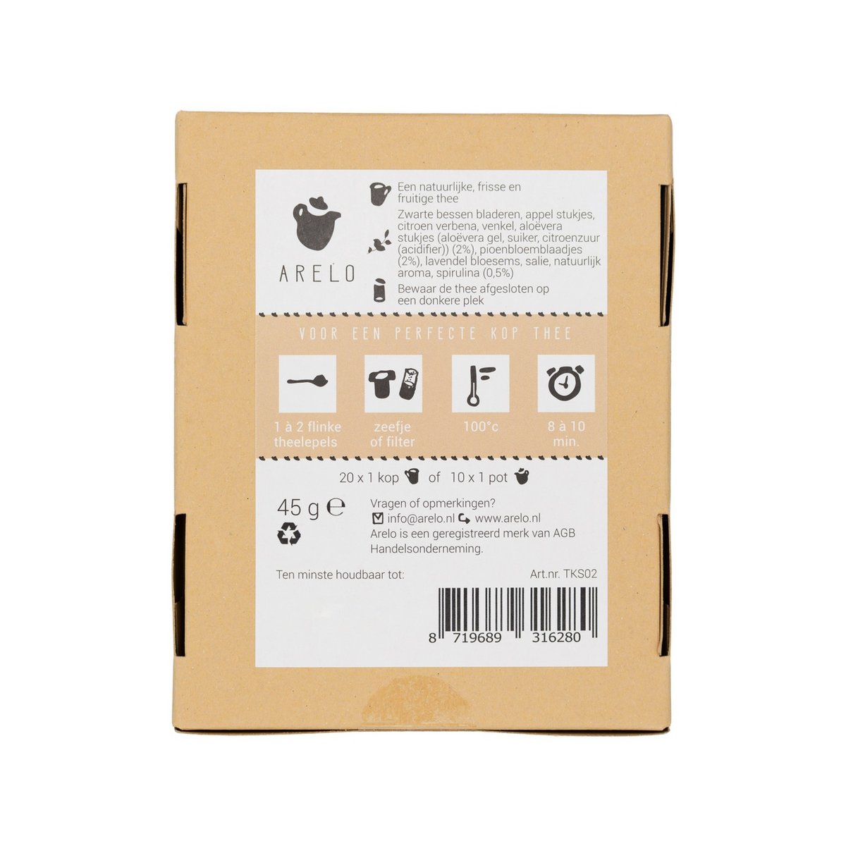 Zwarte bessen bladeren, appelstukjes, citroen verbena, venkel aloë vera stukjes (aloë vera gel, suiker, citroenzuur (acidifier)) (2%), pioenbloemblaadjes (2%), lavendel bloesems, salie, natuurlijk aroma, spirulina (0,5%)