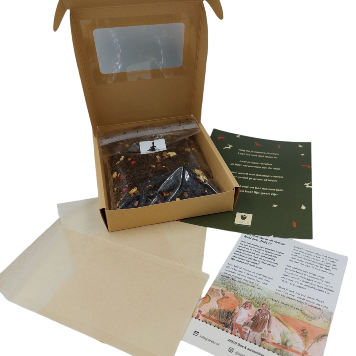 Deze zwarte thee met gember, citrus en specerijen zoals kardemom, kruidnagel en steranijs brengt je gelijk in de kerststemming. Deze kerstthee is super goed in kerstpakketten te verwerken maar ook op zich erg leuk om cadeau te geven. De thee komt standaard met een ansichtkaart met een kerstwens erop zodat hier nog een persoonlijk boodschap op geschreven kan worden. Alle thee van ARELO is verwerkt en verpakt door mensen met een afstand tot de arbeidsmarkt. Al met al mag de Kerstthee van ARELO van niet ontbreken tijden de feestdagen.